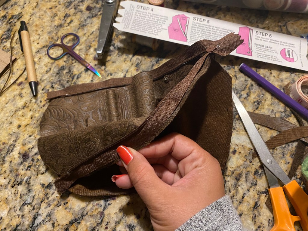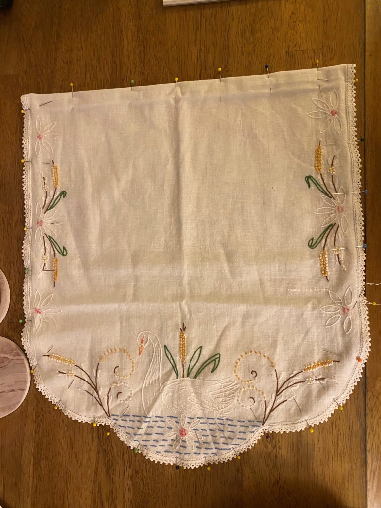 The corners and curves are clipped prior to turning and then all panels are well pressed after turning. One panel made from the cream material and one floral print panel are placed right sides together and stitched along the top unfinished edge. Once stitched, the edge is finished on the inside and pressed open nicely.