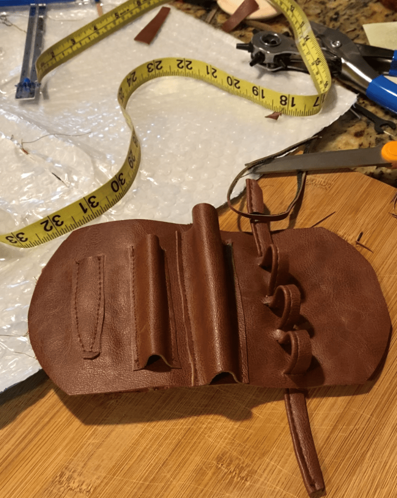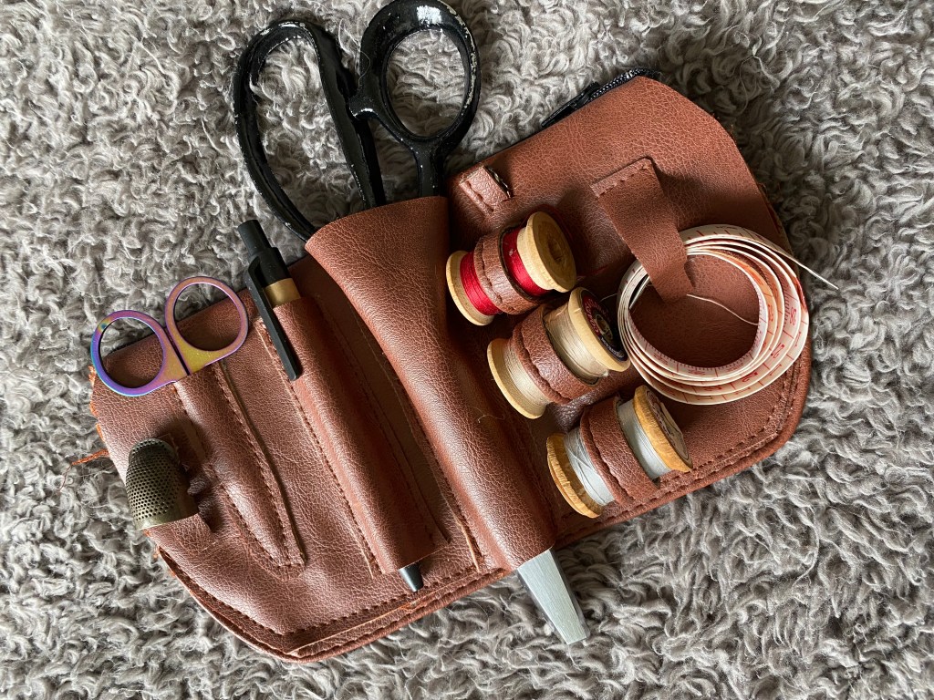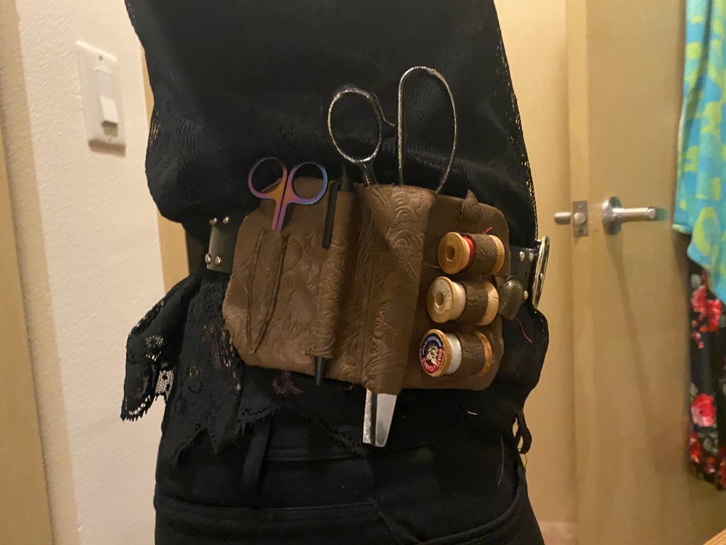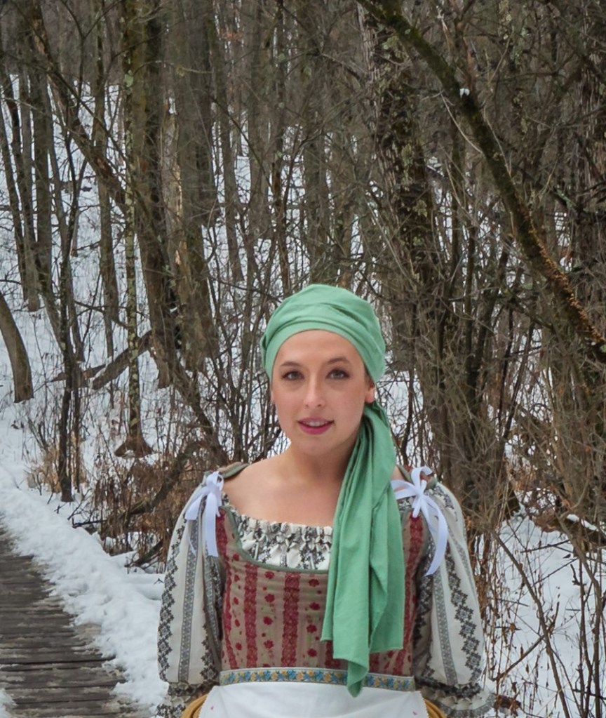 It was at this moment that I realized I’d made an error. The pattern, and historical reference, show the foresleeves to have multiple puffs of white linen at both the bottom and body of the foresleeves. I even have it marked on my pattern pieces to leave windows on the body for these puffs around the wrist area. But I had forgotten to cut them and had chosen to seam and turn the edges rather than using bias tape. If I had used bias tape, I could have cut the puff allowance areas and finished the oval openings with bias tape to match. But since I didn’t, I felt that it would look like a mistake. It was also at the point where I didn’t particularly care to add them in. Hence, I decided not to. Creative liberties!