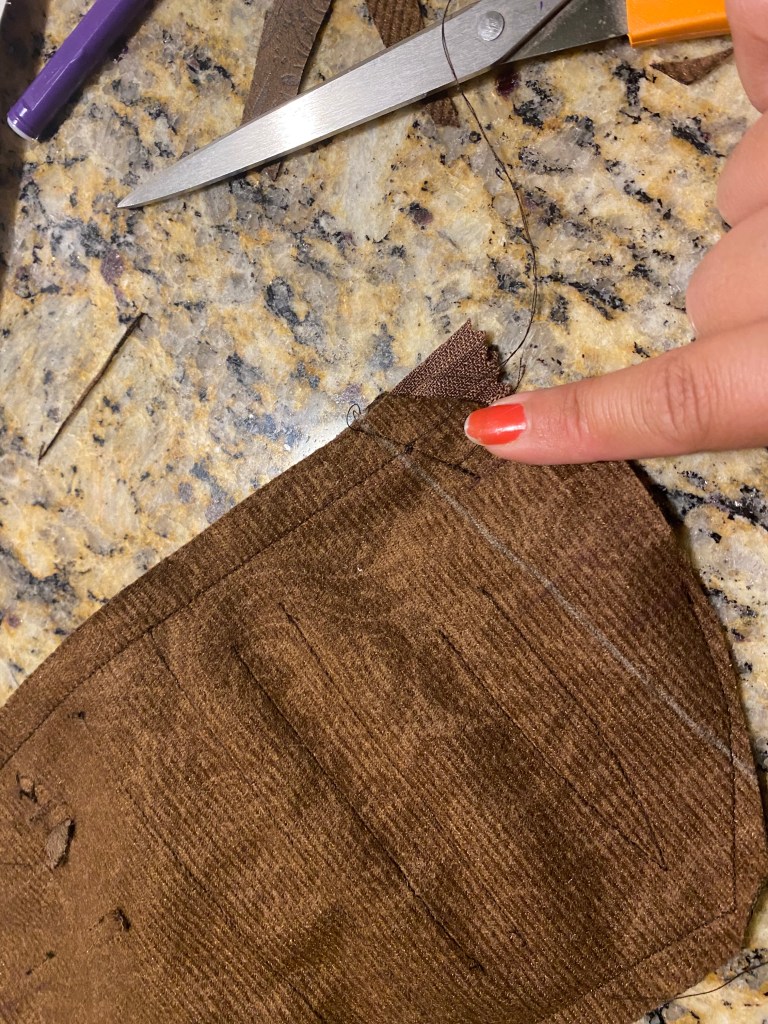 In constructing the foresleeves, I had very minimal fabric remaining that matched the contrasting fabric in the kirtle. It was thankfully just enough to cut two of the foresleeve pattern, but on a fold like the pattern requires. Instead, I cut the two with seam allowance at the top and then cut two more identical pattern pieces from other fabric I had in a similar color palette. Looking back, I wish I had instead used some of the navy blue linen leftover from the gown work for this, but I was stuck in the mindset of wanting the foresleeves to contrast the main gown.