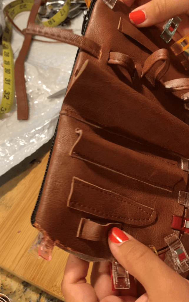 Buckram is a stiff mesh material that is typically used in the construction of hats and bonnets. Here, I am using is like an interlining for the additional strucutre. I cut it from the original pattern paper rather than the cut fabric panels since I do not need or want seam allowance on the buckram or it will cause my seams to be stiff and not turn nicely. I am applying one layer of buckram to each lining with a basting stitch a scant 1/8″ inside the stitching line.